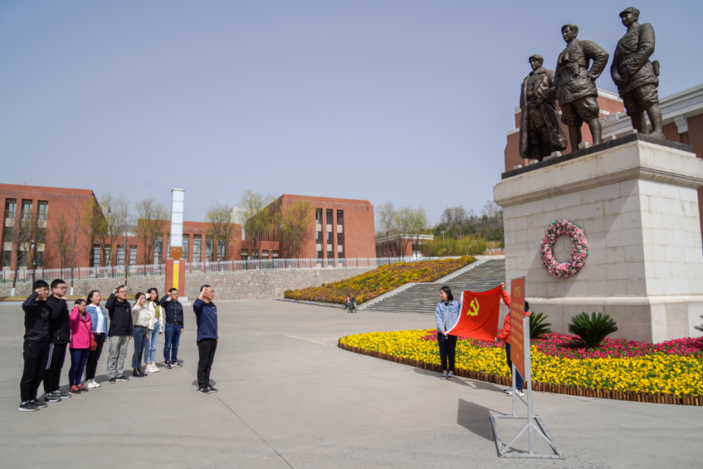 阳春三月、春意盎然,在纪念馆门前,学院党总支书记汪海年同志带领全体党员对着鲜艳的党旗重温入党誓词,铭记初心使命。