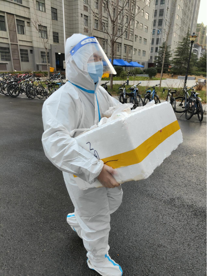 2019级学生党员王熙博自12月16日起担任20号楼1层楼层长兼送餐志愿者。他说道:“我作为一名预备党员,要在关键时刻挺身而出,保障同学们在封闭期间的正常生活,守护大家的安全。虽然承受着志愿工作的劳累和肩上沉重的责任,但是身随心动,乐在其中。今后我也会继续将‘全心全意为人民服务’的宗旨牢牢记在心中。”