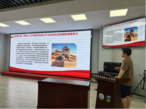 刘宇涵随后分享了以案说纪——党纪学习教育专题党课。她通过一系列生动具体的案例,分析了违反党纪的严重后果和影响。她强调,党纪处分不仅是对个人的惩戒,更是对全体党员的警示,大家要以案为鉴,深刻汲取教训,自觉遵守党纪国法。