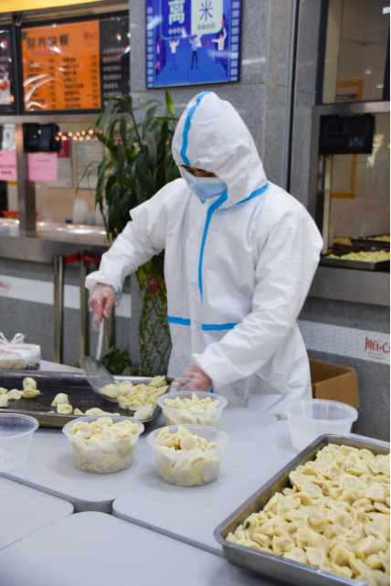 天近拂晓,为让同学们尽早吃上香喷喷的水饺,志愿者们快步流星,加快送餐速度,将这份温暖及时“护送”。