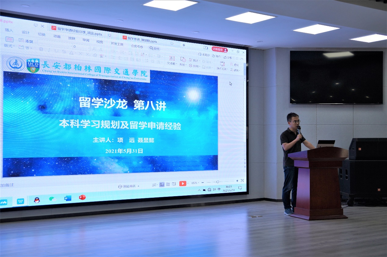 在鸿远教学楼四楼报告厅举办“留学沙龙”第八讲,主题为本科学习规划及留学申请经验。本次活动邀请到2017级道路桥梁与渡河工程(国际班)本科生项远和2017级交通工程(国际班)本科生聂显懿做经验分享。学院各年级学生200余人参加了本次活动。活动由学院团委书记陈朔主持。
