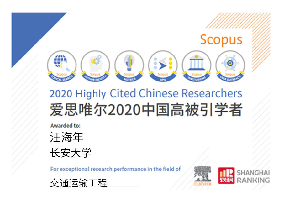 院长汪海年教授入选Elsevier2020年交通运输工程领域“中国高被引学者”。