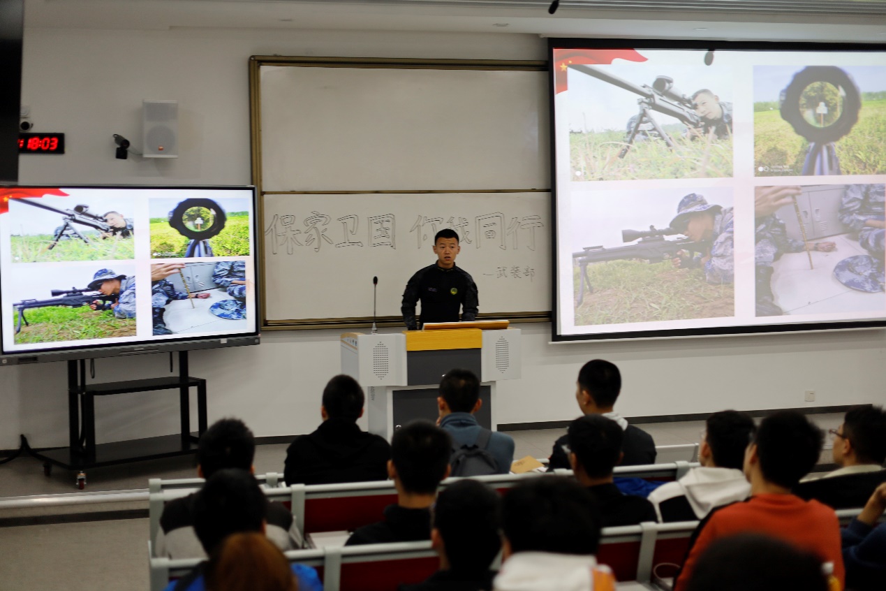 李健从部队经历、感悟和入伍号召两个方面进行宣讲。他从自身服役的伞降兵兵种入手,向同学们分享了高空跳伞和狙击训练的难忘经历。军旅生涯虽然艰苦不易,但这在李健铿锵有力的话语中却显得微乎其微,处处彰显着军人的赤诚热血。