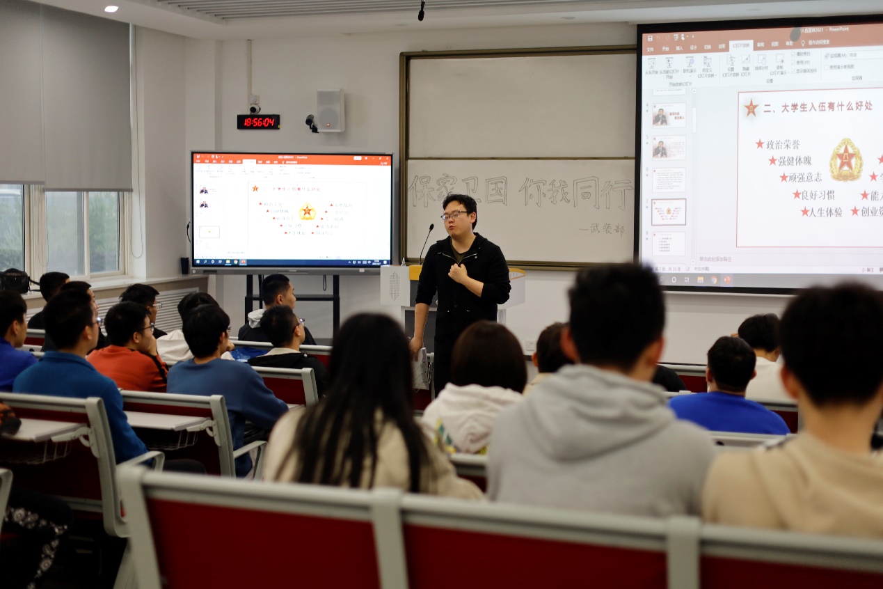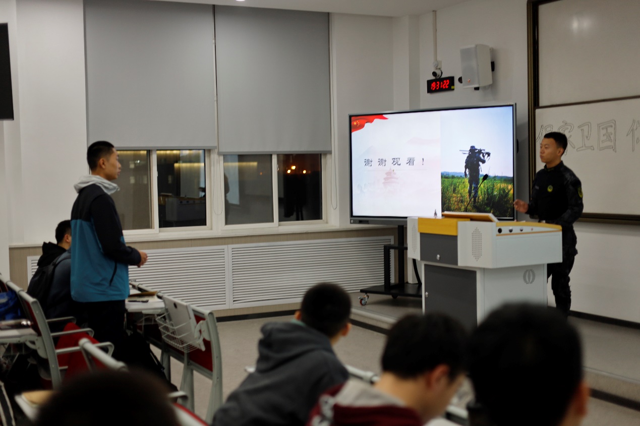 优秀退伍大学生、弘毅中队李健进行国防安全教育和应征入伍政策宣讲。2018级辅导员曾妍和学院部分学生参加活动。本次活动由武装部国防教育科副科长刘天宇主持。