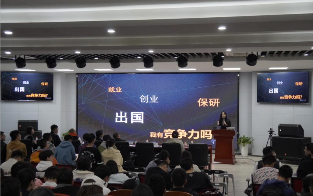 报告环节,王骁以大量数据统计结果和实例,从就业、保考研、创业和留学四个角度,向同学们展示毕业后的发展路径,以及在本科期间所应做出的准备。王骁指出,本科期间的学业成绩作为硬实力的体现对于各项发展路径都非常重要,但同学们同样需要提升软实力才能更好的追逐未来的发展目标。同学们需要根据个人目标,提早在科研项目、论文产出、资格证书、实习经历等领域积累成果,不断为自身赋能,提升个人核心竞争力,才能在毕业时交出满意的答卷。