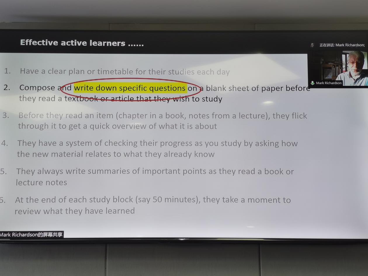 本次线上讲座提高了同学们对自主学习的认识,并对大家的大学生活乃至终身学习产生了重要启发。希望同学们在学习完本次课程后,能够认真思考和总结适合自己的学习方法,制定目标,积极提问,有条不紊,求真务实,在思想上不马虎大意,在行动上不拖泥带水,争取做一个优秀的‘activelearner’。