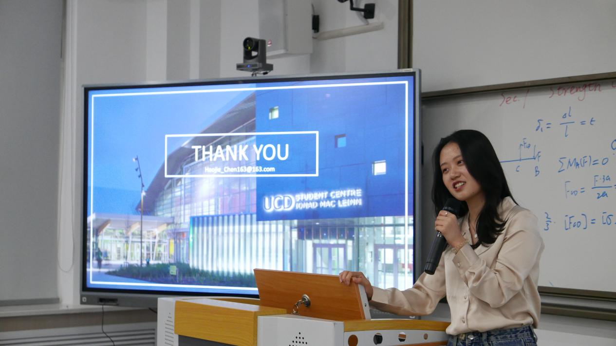 公路学院公路道路桥梁与渡河工程专业(国际工程班)毕业生,留学爱尔兰都柏林大学,获得土木工程硕士学位,现为知名国际工程咨询公司ATKINS结构工程师。她就留学爱尔兰都柏林大学的经历与同学们进行了分享,多角度介绍了爱尔兰的学习情况、日常生活及工作前景等,并现场解答了大家关于留学爱尔兰的相关问题。