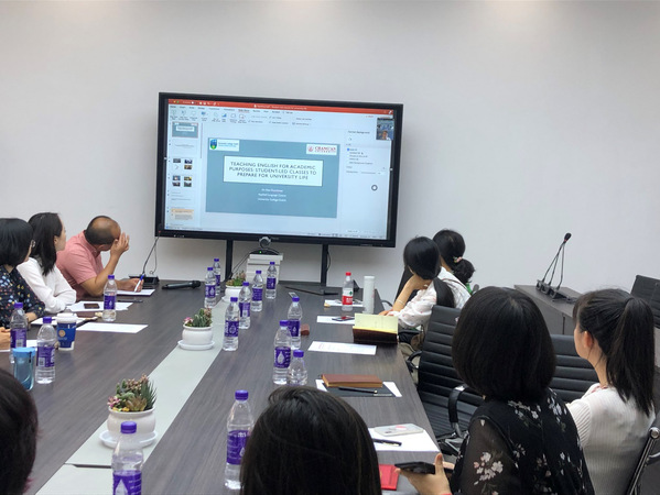 会议还邀请了英语课程年级负责人钟峰老师和李锦老师分别作了题为《栉风沐雨,砥砺前行》、《为师之路,学亦无止境》的英语教学经验交流。两位教师代表与参会老师分享了个人英语教学心得,总结了中外合作办学英语教学的特点,强调语言教学与文化教学相融合的重要性,着重介绍了中外合作办学英语教学过程中存在的特殊性及挑战性。