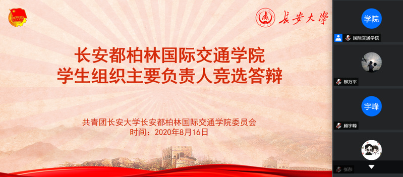 第一届学生组织竞选答辩会在南校区公路学院会议室召开。学院党总支书记、院长汪海年、学院党总支副书记、副院长姚以亮、学生事务部副主任孙士强、院团委书记陈朔,2018级辅导员曾妍参加答辩会并担任评委。答辩会采取线上线下相结合的方式进行,会议由陈朔主持。