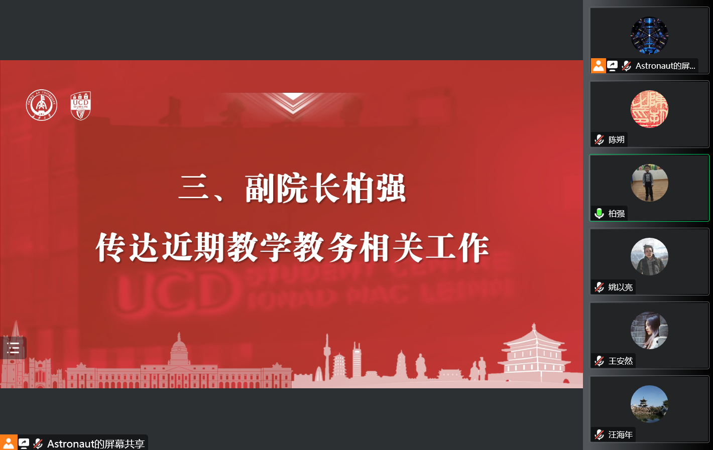 学院副院长柏强传达近期教学教务相关工作。他表示,要逐条推进落实师生联络委员会会议及教师座谈会上收集的意见建议;要做好线上教学质量保障工作,保证考试顺利进行;国际交流相关工作要按照原计划继续推进。
