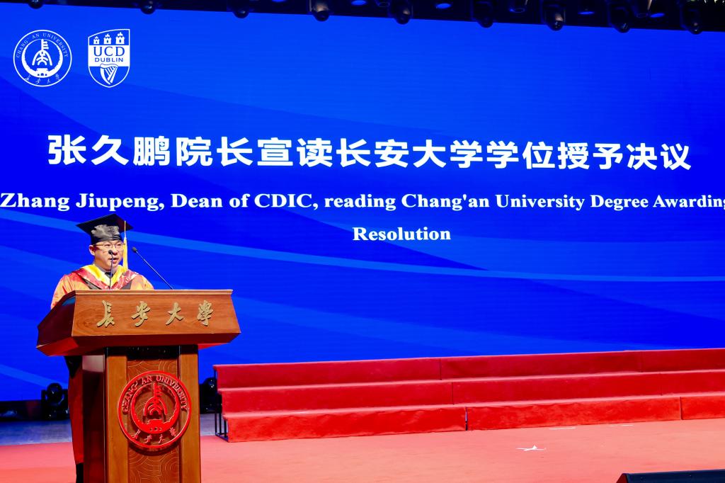 在学位授予环节,Regina Uí Chollatáin教授授予都柏林大学学位,张久鹏宣读黄色仓库