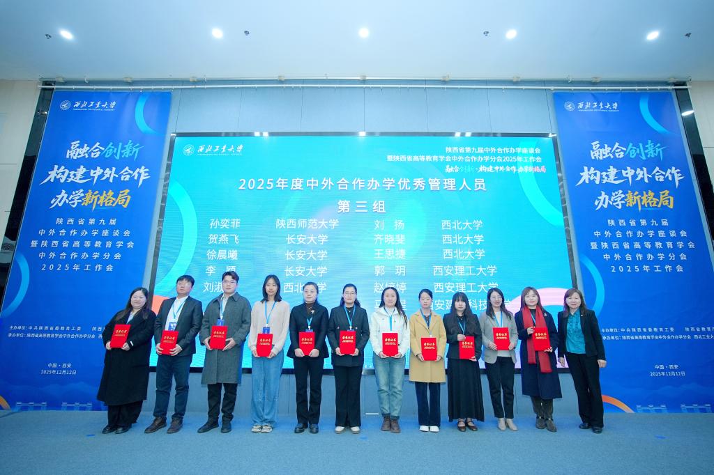 大会现场举行了2025年度优秀中外合作办学机构(项目)及优秀管理人员表彰仪式。学院获评陕西省2025年度中外合作办学优秀机构,不仅再度荣膺此项殊荣,更创下五年蝉联的亮眼佳绩。学院副院长贺燕飞、教学教务部徐晨曦荣获陕西省“2025年中外合作办学优秀管理人员”称号。