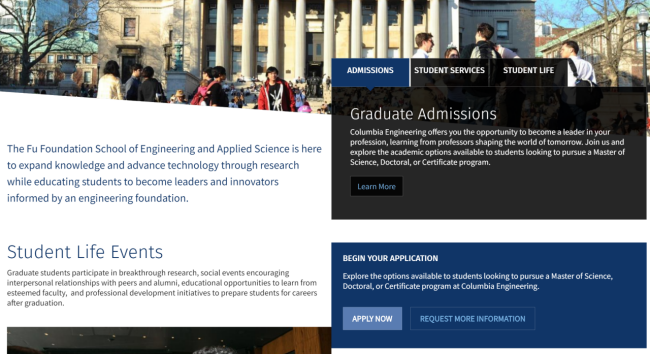 哥伦比亚大学工程与应用科学学院( Fu Foundation School of Engineering and Applied Science)是美国历史上第三所工程学院,也是纽约州第二古老的工程学院。学院提供一个独特的教育机会,开设了工程和应用科学方面的本科和研究生项目,学生最终能够获得学士,硕士,博士学位。工程与应用科学学院包含多个研究项目,有专门设计和装备的设备设施以满足实验室和研究需要,学校是基础和高级研究的基地,从哥伦比亚分子纳米结构电子传输中心到哥伦比亚基因组中心无所不包。
