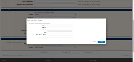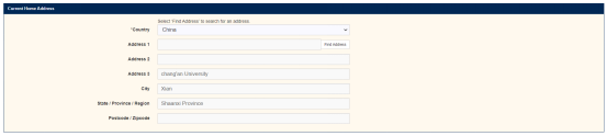 家庭住址信息:第一栏下拉选择国家China之后,会跳出地址框,点击旁边的Find Address,会跳出搜索栏,选择人工输入地址ADD/EDIT ADDRESS MANUALLY,这样就可以敲入你的地址了,输入地址完成后,选择SELECT
