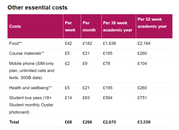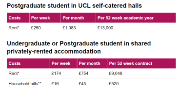 一般伦敦地区留学一年花费约40-50万RMB,具体专业的学费可在专业介绍下选择international student查看,以下为UCL官方提供的食宿以及日常消费参考: