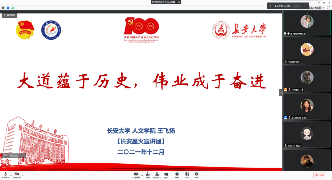 星火宣讲团的王飞扬和刘丹丹同学分别从国家层面和个人层面以《大道蕴于历史,伟业成于奋进》和《人在路上,路在心中》为主题,生动讲述了党的十九届六中全会精神。
