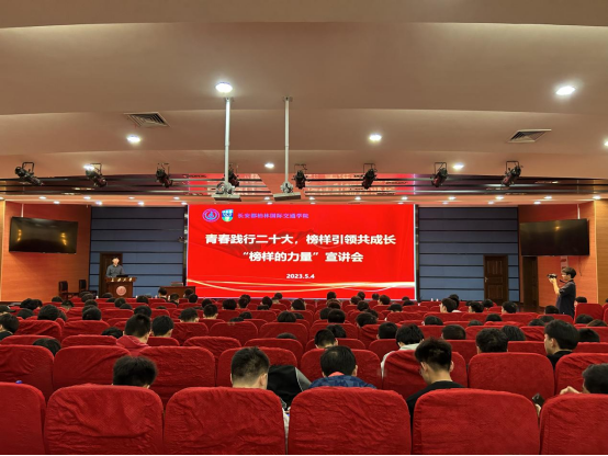 于5月4日在行政楼会议中心二楼报告厅举办“青春践行二十大·榜样引领共成长”榜样的力量宣讲会暨朋辈论坛第八讲。学院党总支副书记、副院长姚以亮,学生事务部全体辅导员及2022级全体学生参加宣讲会,会议由学生事务部主任孙士强主持。