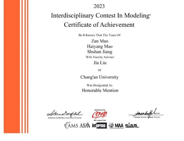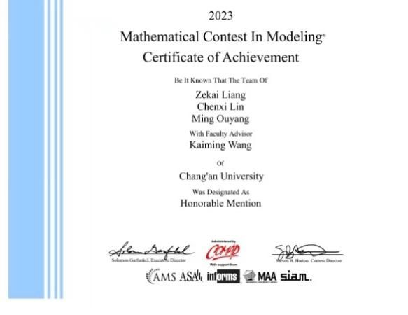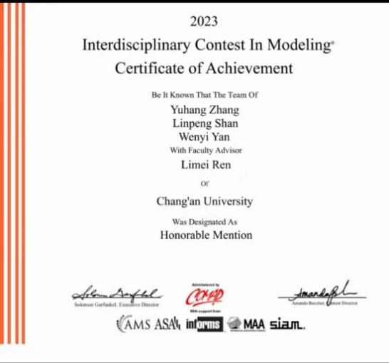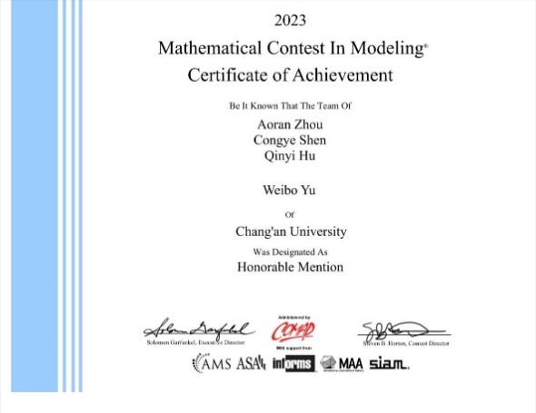 学生团队再创佳绩。来自2020级的罗寓文、陈洋、张昊炜三位同学在理学院的高普阳老师指导下获特等提名奖(Finalist)。美赛官网显示全球特等提名奖(Finalist)获奖比例约为2%,该奖项是黄色仓库