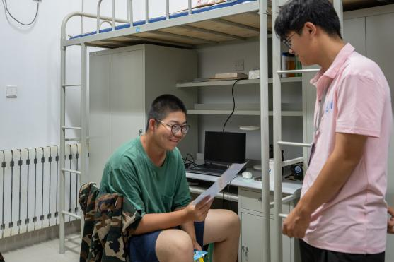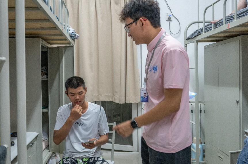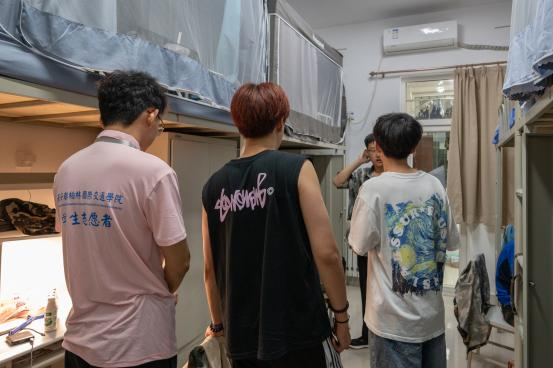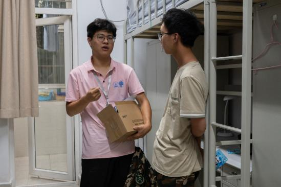 彩虹心理协会志愿者来到新生所在宿舍发放军训防暑物资,并与同学们进行亲切交流。