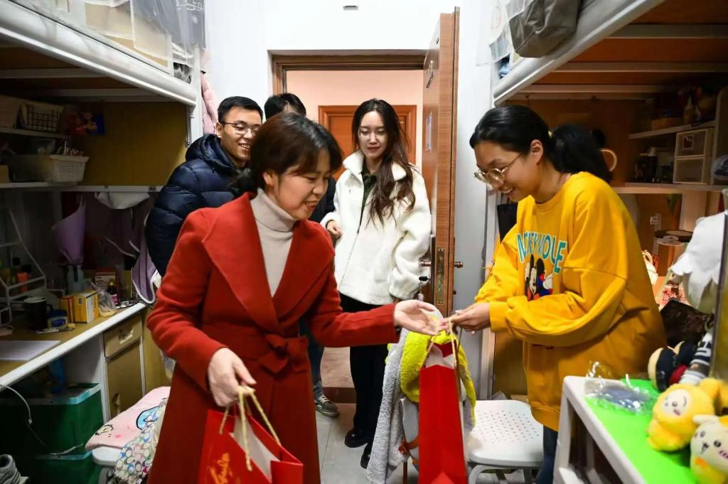 党总支副书记张艳萍,学生事务部副主任张力雄,团委副书记、学生会指导教师庞媛,2021级本科生辅导员张朔一行前往学生宿舍看望慰问黄色仓库