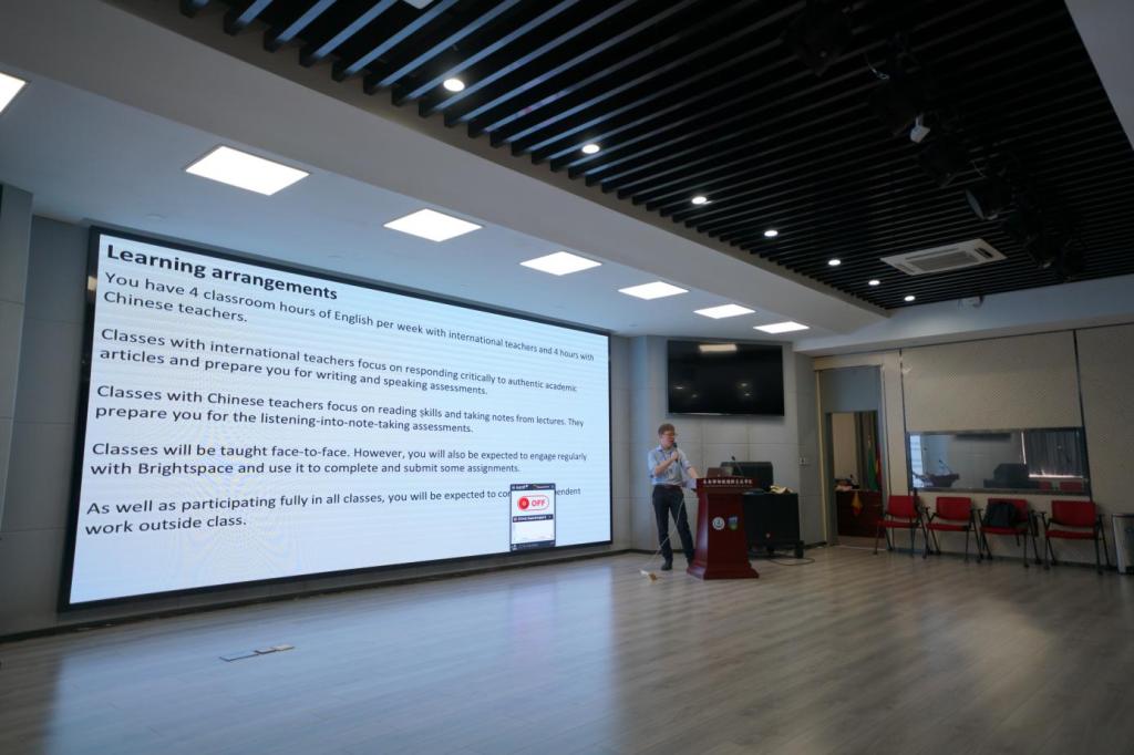 会上,Alex Runchman和Stephen Kelly针对大二年级英语课程的不同培养目标和学习目标进行了讲解与介绍,并组织与学生互动了解学生对英语课程的疑问和建议。他表示,大家应将英语学习目标由能力培养逐渐调整到学术导向,任课教师将把培养方向调整为提升学生的学术文章写作能力等,为大三大四开设的都柏林大学全英文的课程打好基础,为学术论文写作做好准备。
