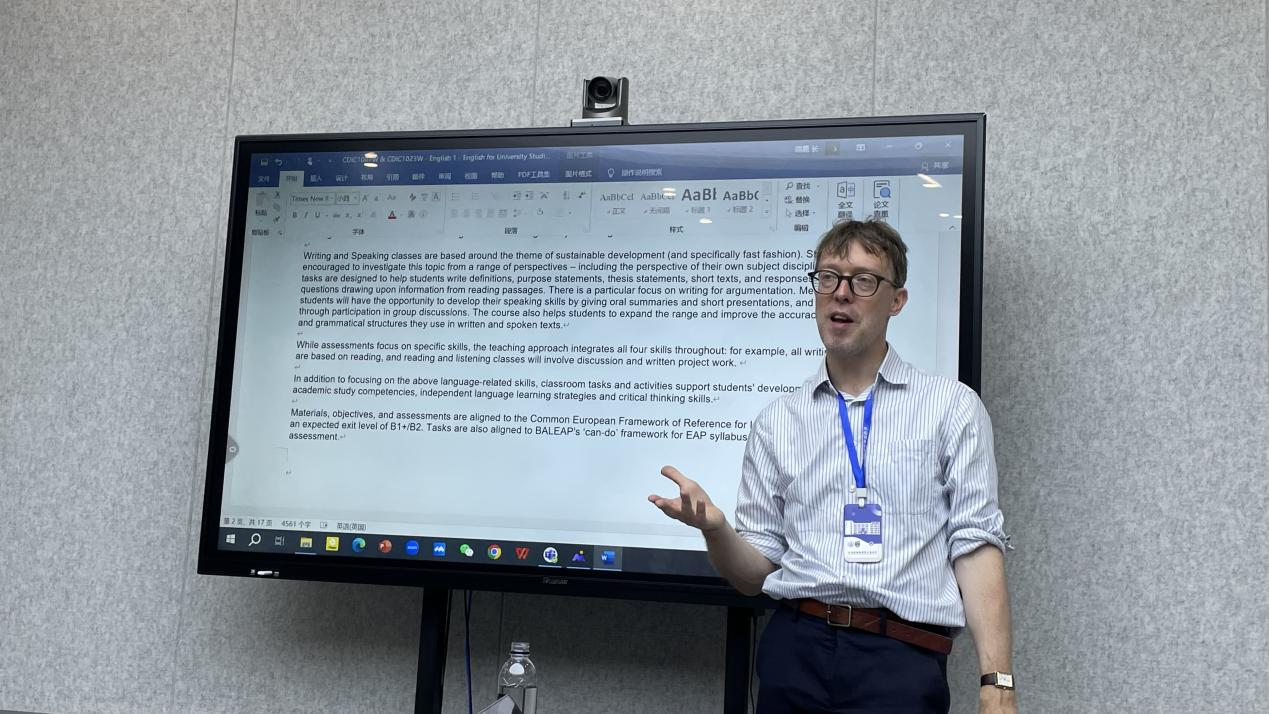 会上,Alex Runchman和Stephen Kelly向参会教师介绍了2023-2024学年秋季学期的英语课程教学大纲,强调了2023级中外合作办学新生教学的特点和本学期教学中各位老师可能会面临的挑战。此外,Alex结合中外合作办学英语课程以及教材内容特点,向参会教师分享了英语课程教学方面的实质性意见、建议和策略。